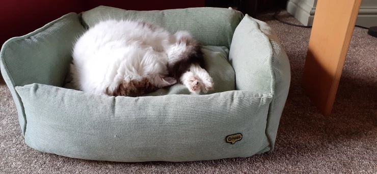 Beschriftung Ich habe das schöne Omlet katzenbett bestellt, aber leider war es zu klein, obwohl yeti es liebte. aber er liebt auch das ersatz-hundebett! so verwöhnt....