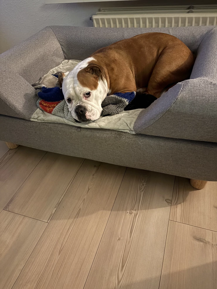 Beschriftung Bella liebt ihr bett und will es nicht mehr verlassen🥰.