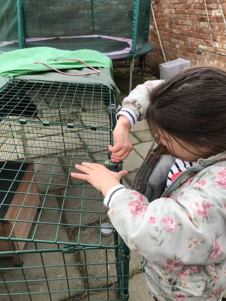 Beschriftung Die clips haben es uns ermöglicht, das dach zu öffnen und so die kaninchen sicherer aufzunehmen, anstatt durch eine kleine tür zu klettern, während wir sie festhalten.