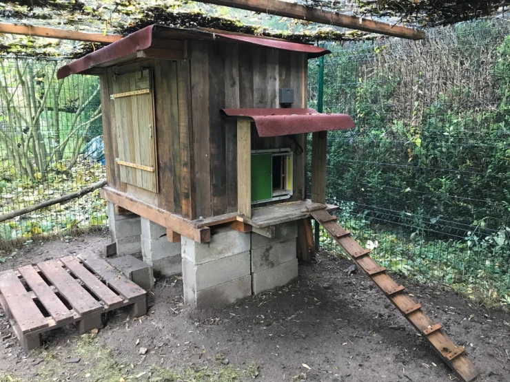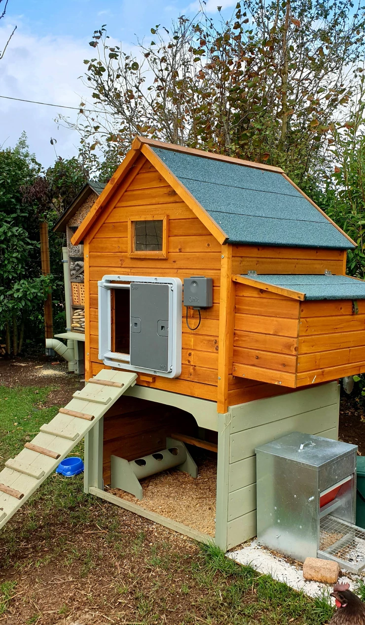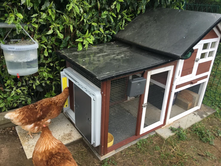 Beschriftung Omlet graue automatische hühnerstalltür verbunden mit einem hühnerstall aus holz