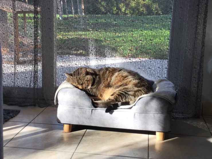 Beschriftung Katze schläft auf Omlet grauem nackenrollen-katzenbett mit runden holzfüßen