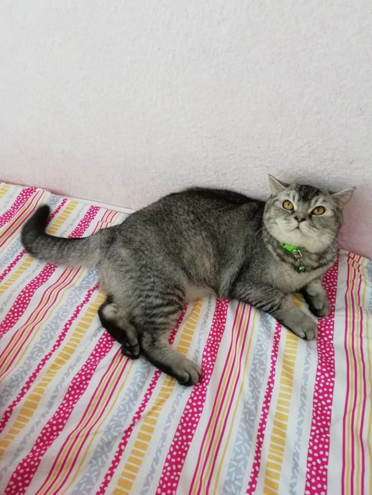 Beschriftung Britisch kurzhaar tabby katze legt sich hin
