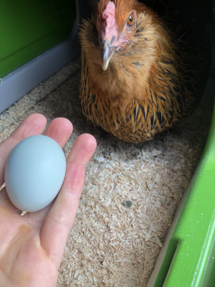 Beschriftung Huhn in Eglu Cube großer hühnerstall mit hand, die ein ei hält