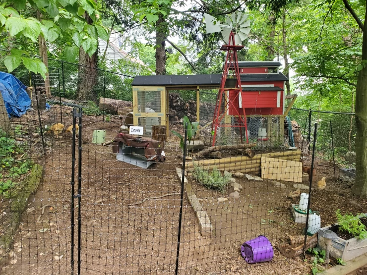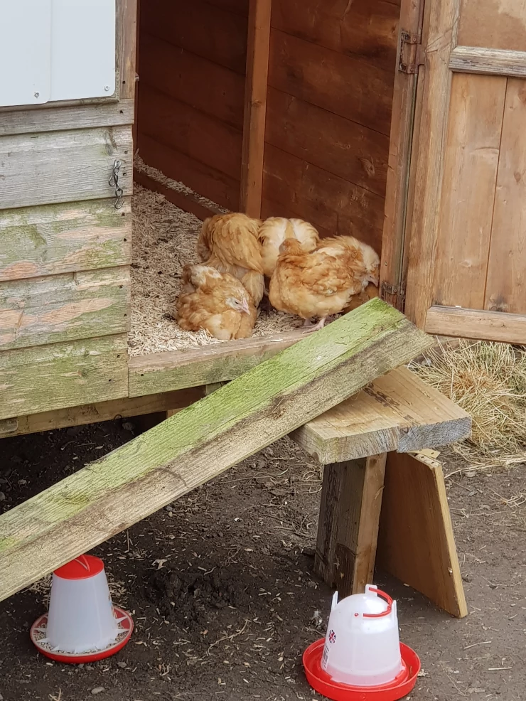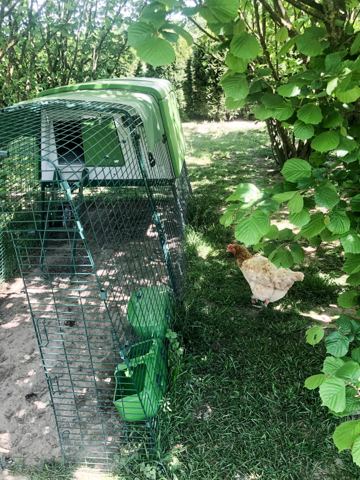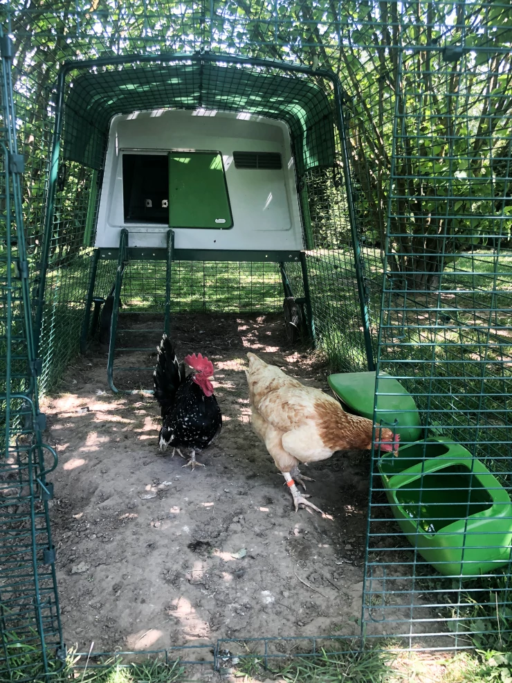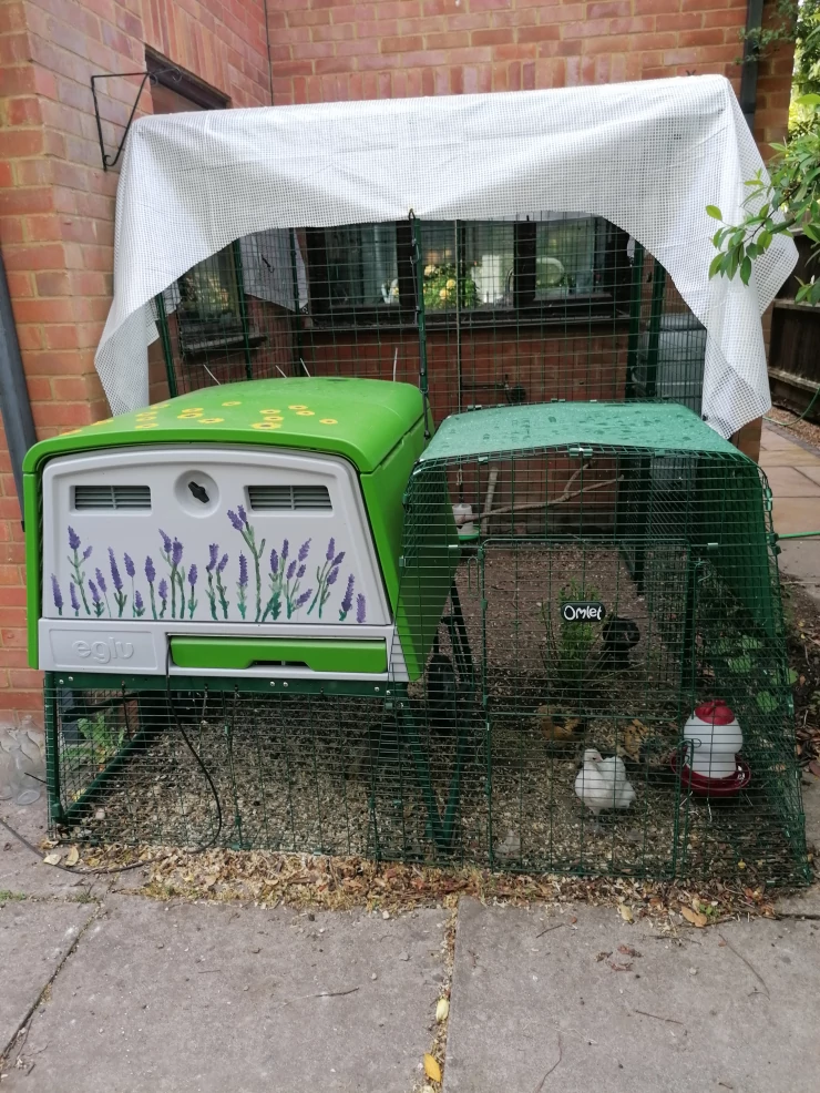 Beschriftung Unser Eglu Cube und auslauf, der an den 2m x 2m großen auslauf angeschlossen ist. meine schwester hat ihn mit gemalten blumen dekoriert und er sieht wirklich hübsch aus.