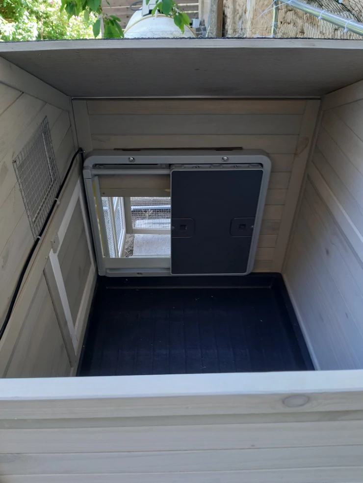 Beschriftung Hühnerstall aus holz mit Omlet grauer automatischer hühnerstalltür