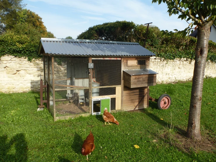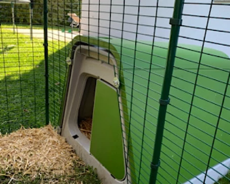 Beschriftung Omlet grüne automatische hühnerstalltür an hühnerstall aus holz mit hühnern draußen im garten