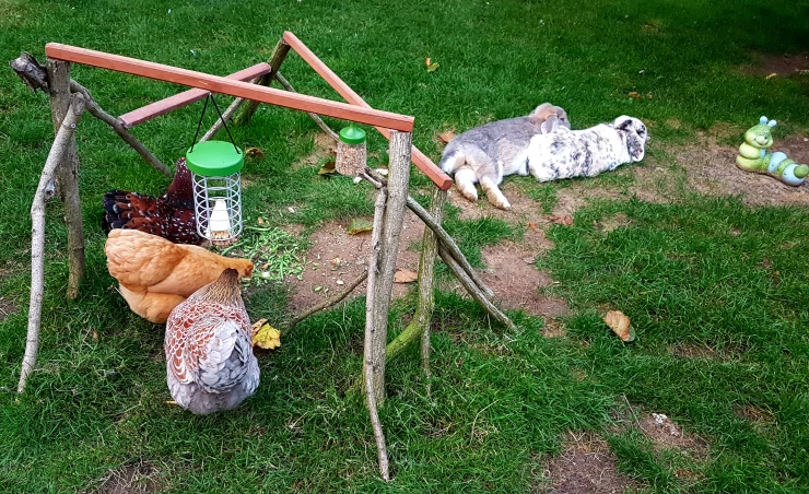 Beschriftung Hühner fressen futter, während sich kaninchen im garten niederlassen