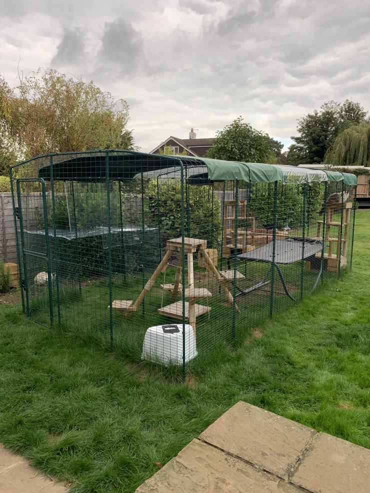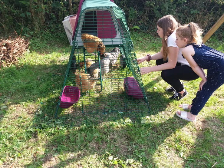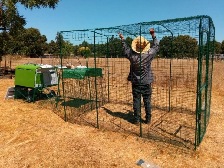 Beschriftung Mann beim aufbau von Omlet begehbarem hühnerstall mit Omlet grün Eglu Cube großem hühnerstall und auslauf