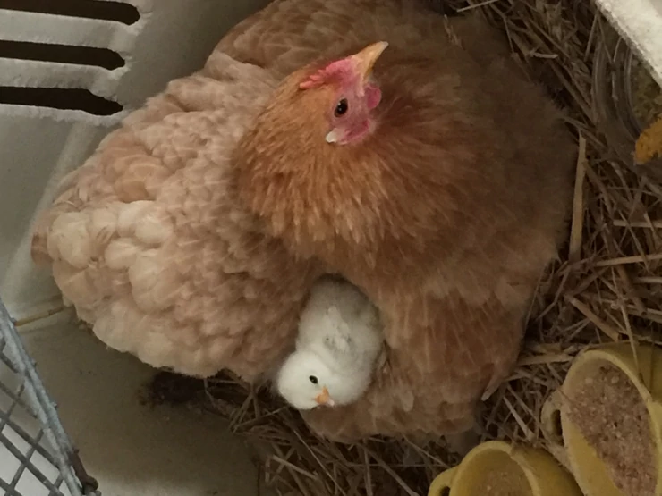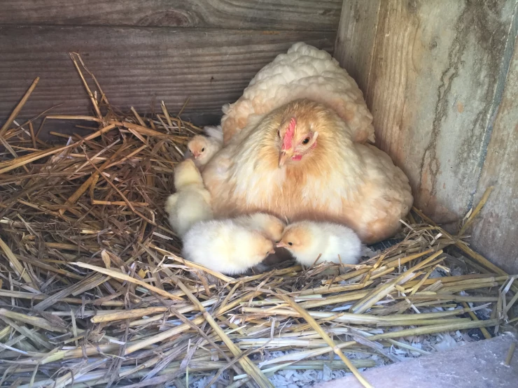 Beschriftung Hühner sitzend mit ihren küken im hühnerstall