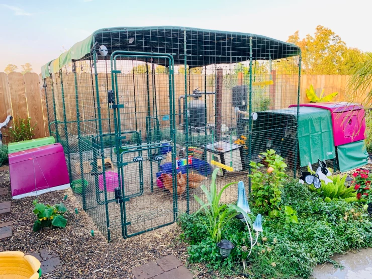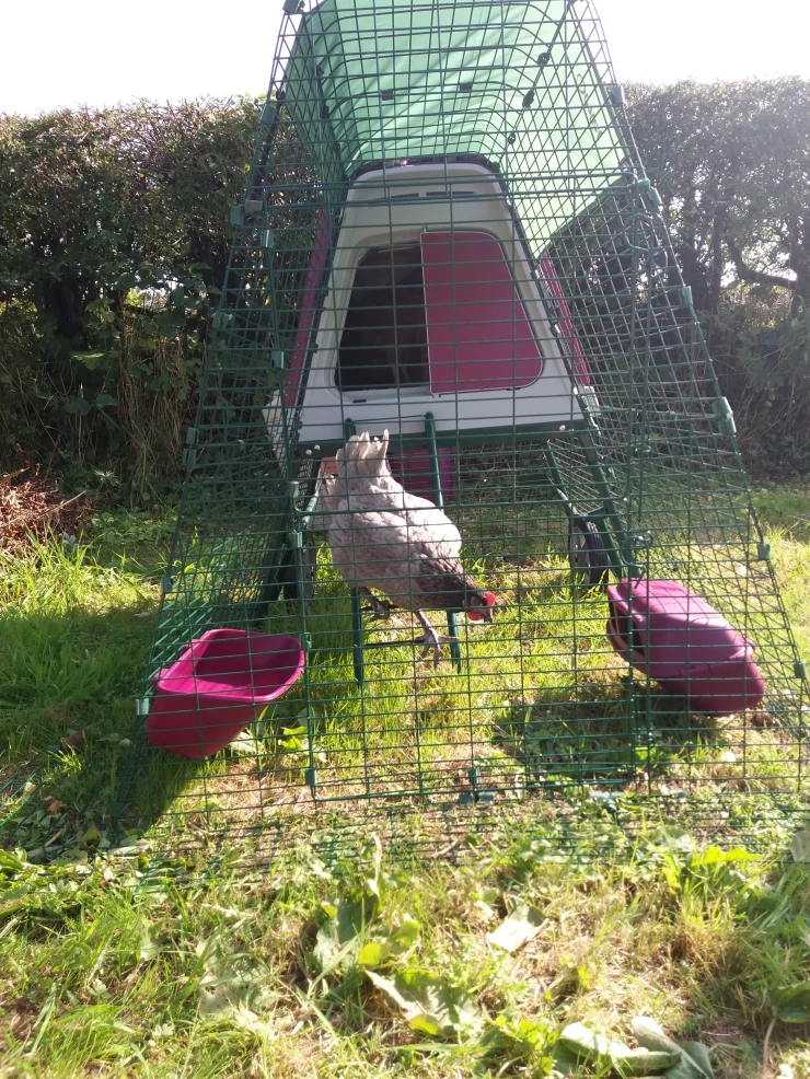 Beschriftung Omlet begehbarer hühnerstall mit lila Eglu Cube großer hühnerstall und auslauf verbunden mit grün und lila Eglu Go aufgeständerte hühnerställe verbunden