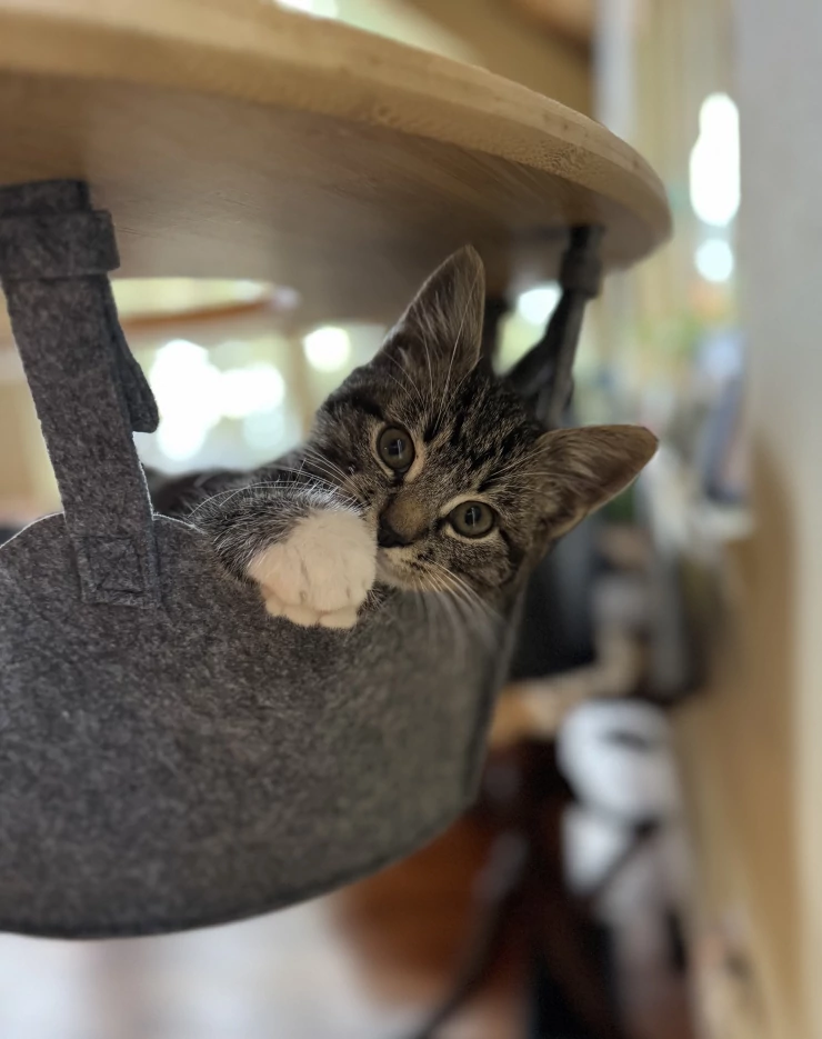 Beschriftung 3 pflegekätzchen hängen in unserem Omlet kratzbaum herum