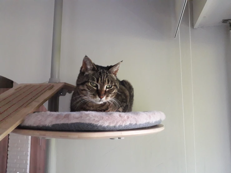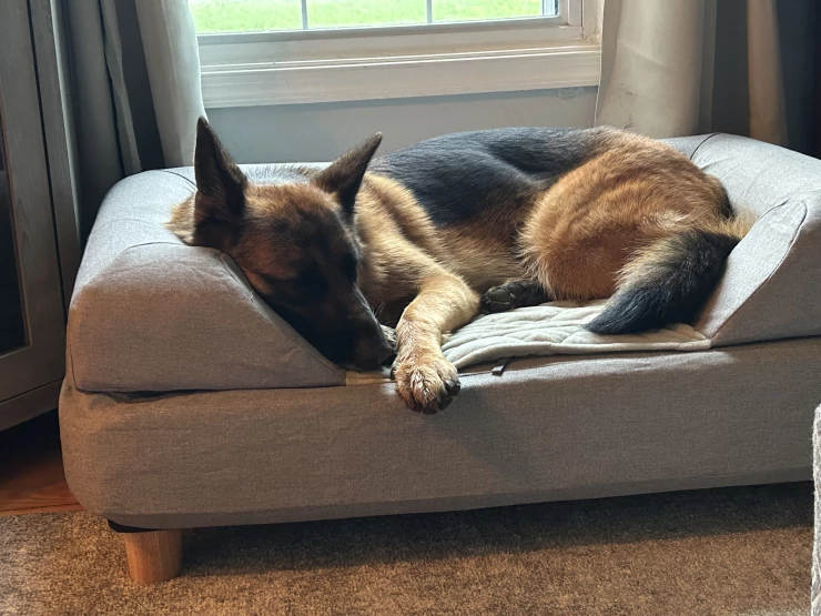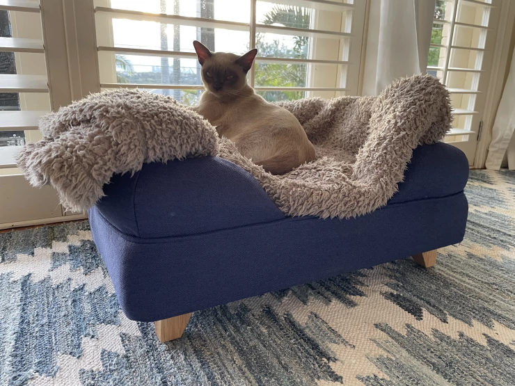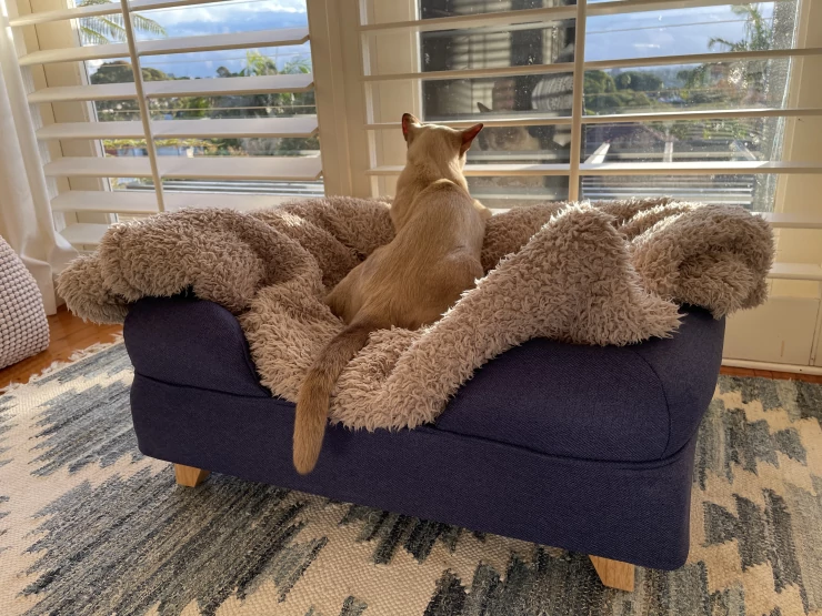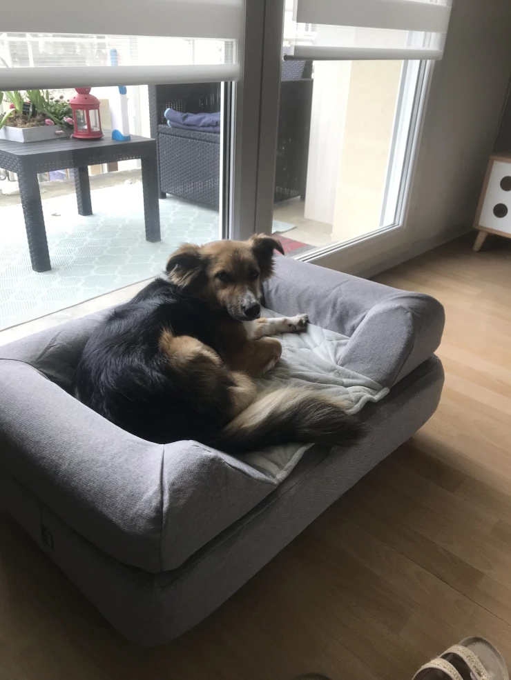 Beschriftung Max im Überwachungsmodus bequem auf seinem weichen schafskissen sitzend