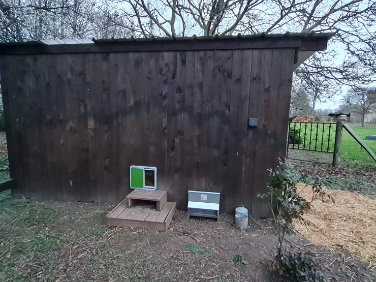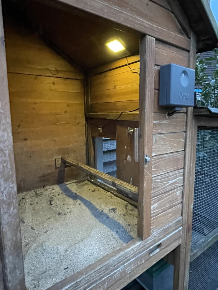 Beschriftung Tür Omlet auf einem großen holzstall installiert. innerhalb von 15 minuten waren meine hühner sicher und ich erleichtert, dass ich mich nicht mehr um das Öffnen und schließen kümmern musste.