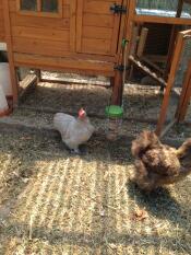 Hühner außerhalb des hölzernen hühnerstalls mit Omlet Caddi hühnerleckerli-halter