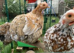 Huhn stehend auf Omlet universal hühnerstange im Omlet hühnerauslauf